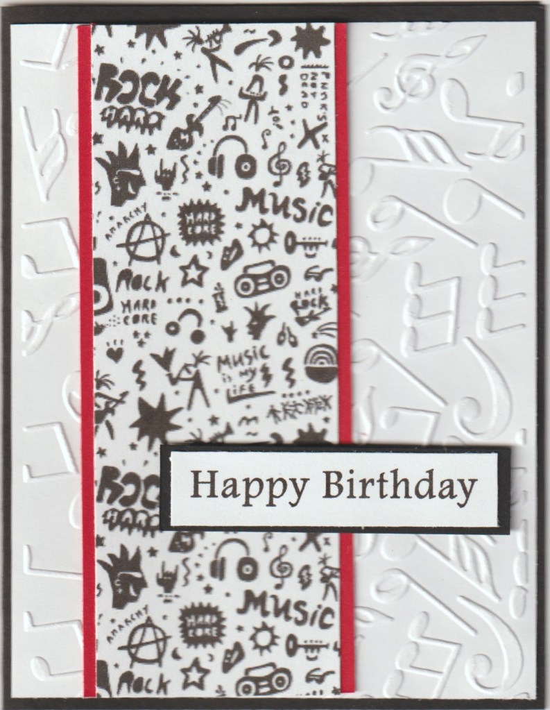 Hello and welcome. Today’s card is for one of our favorite bussers at our favorite restaurant. He has a band that plays locally so I thought a music themed card would be good. He always calls us ‘love birds’. 🙂