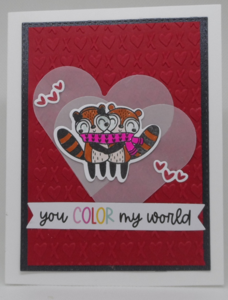 My hubby’s Valentine’s card this year includes a red embossed panel with hearts and X’s using an unbranded embossing folder from my stash. Spellbinder’s heart die was used to cut vellum hearts to back my Gina K Designs 12 Days of Christmas “A Paper Hug” stamp set. Ephemera sentiment was also die cut. It was a sweet card for a sweet hubby.