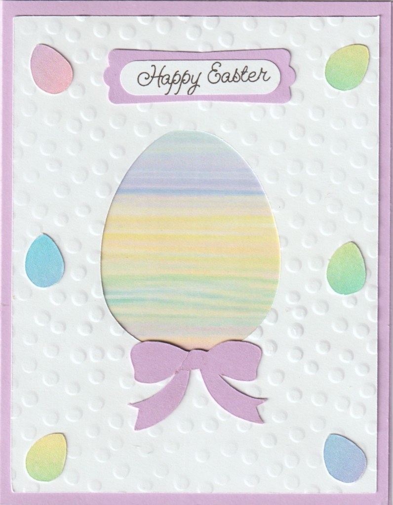 Hello and welcome. After seeing several Easter cards with this design on Pinterest, I decided to try one. Eggs and bow were all cut on the Silhouette, sentiment labels are Stampin Up’s modern label and word window punches. Sentiment was printed on the computer. Bow and border eggs have Wink of Stella on them for a little sparkle. Embossing folder used is dots by Stampin Up, pp was found online. I’m not sure if I really like it or not so it may not get sent to anyone. Maybe the next one will be better.