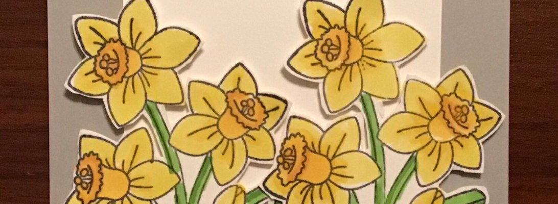 I used Newton’s Nook stamps, daffodils and also tulips. I used Ohuhu markers to color then fussy cut each image. The gray cardbase is SU. The white paper is Gina K Designs Artists Choice. I rounded the corners with a SU corner rounder punch.