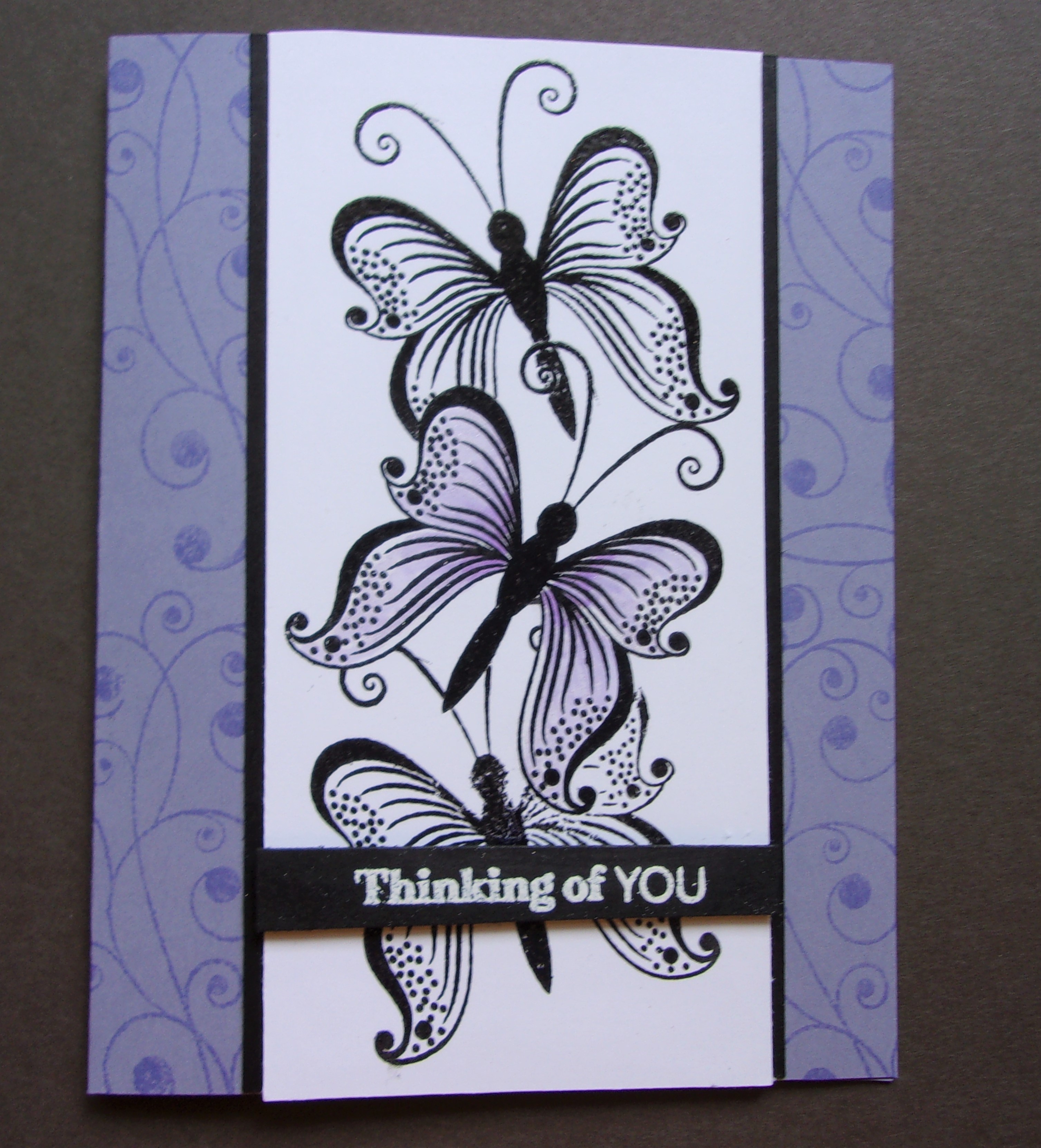I masked the middle butterfly, then stamped the butterflies above and below. I colored the middle butterfly and left the other two white. My background was quite plain, so I used the flourish stamp in the set with ink that closely matched to give it a bit of background. I used a set designed by Gina K Designs for a Catherine Pooler’s Stamp of Approval collection. It is called Beautiful World. The background paper is Stampin’ Up Wisteria Wonder, stamped with GKD Wild Wisteria. The black ink is Versafine Onyx Black. The sentiment is from SU Paper Pumpkin, Sentimental Rose (April 2019).
