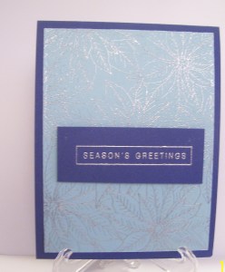 This took me a little over 7 minutes. When first got the Poinsettia background by Simon Says Stamp,  I stamped and embossed a bunch of backgrounds to use for Christmas cards. This was stamped Ocean Mist embossed with silver. I trimmed the 6” square panel using a die from Matting Basics B by Spellbinders. The card base is Blue Denim trimmed 4 ¼” x 11” scored at 5½”. I just happened to have a scrap that was the right size for the sentiment from Holiday Greetings Mix 1 by Simon Says and used MISTI to get it centered. That was also embossed in silver and mounted with foam tape for dimension. Since I still had a couple of minutes to spare, I cut an Ivory panel for the inside, stamped with a sentiment from Holiday Greetings Mix 1 in Denim Blue.