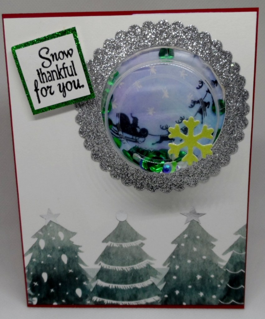 Inside my cup is Santa and is reindeer from GKD’s Poster Board Christmas, Sentiment from Sweet ‘n Sassy’s Winter Silhouettes, my background was from a Michael’s craftsmart paper pad, used some green sequins and gem stones for the shaker, created a spellbinder’s frame for the outside and a snowflake to cover some of the print on my “acrylic” cup.