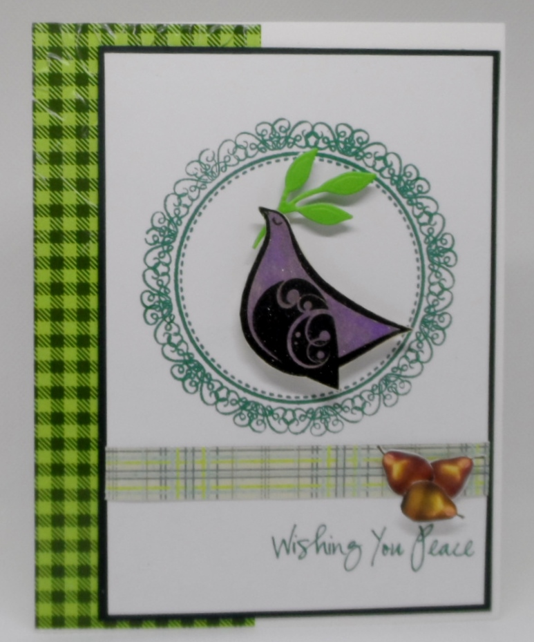 Partridge in a Pear Tree….but wait where’s the tree! For my card for the Double D Challenge of Twelve Days of Christmas, I chose Day 1 “Partridge in a Pear Tree” but only after searching through some stamp sets for what I believe is a partridge. My partridge and the sentiment were both from a 2008 The Cat’s Pajamas clearly swanky stamp set. The frame stamped in GKD’s Christmas Pine ink is also a GKD stamp from Christmas Wishes. In lieu of an actual tree, even though you cannot make it out clearly, I did emboss the checked layer of patterned paper with a Darice tree embossing folder and the “golden” pears were found online and fussy cut. The sprig of leaves is a Tim Holtz Sizzix thinlits die that I trimmed down to fit.