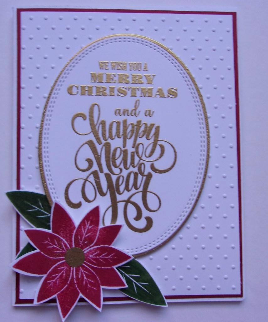 The colors used are Shaded Spruce for the leaves, Cherry Cobbler for the flower and cardbase, and gold for the greeting and layer. The stamp set used is Merry and Bright by Gina K Designs. I used the Cuttlebug Swiss Dots embossing folder. I rarely think of layers for a CAS card, but this one has a lot of white, so I think it will work for CAS.