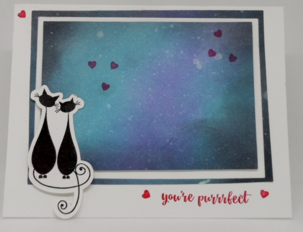 My current card uses the kitties and same sentiment from the Better With You stamp set and the hearts in my night sky are GKD’s Spoon Me set. The sky was created with Distress Inks in Broken China, Wilted Violet, Black Soot, a little water and Hero Arts white iridescent shimmer spray. A2 layers dies from Waffle Flower were used for my panels.