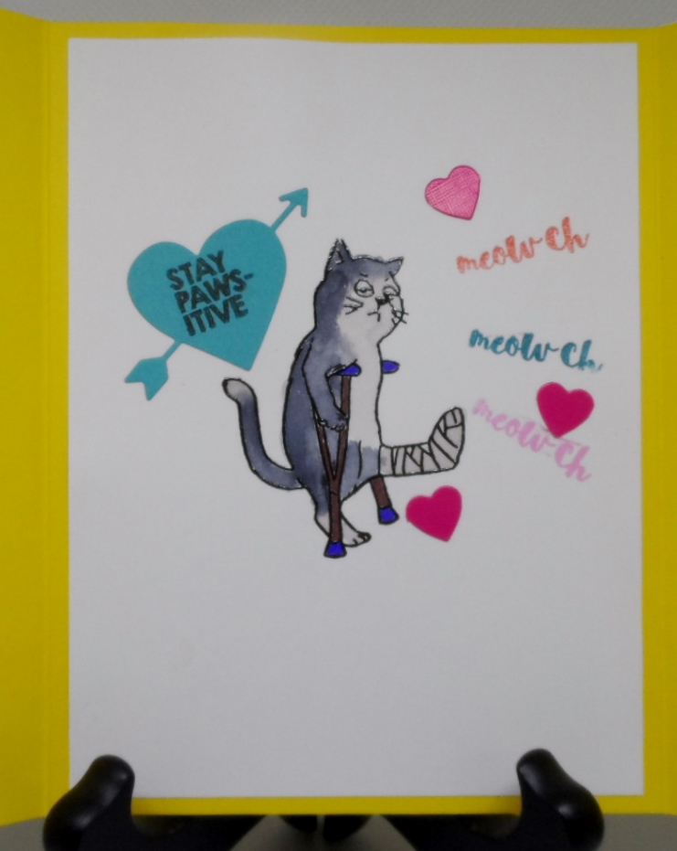 A girlfriend has had foot surgery and is non-weight bearing for 6 weeks. This is my card to cheer her up. She and her husband are cat people over dogs so I thought she may get a chuckle out of this card. The outside gatefold only took three attempts to create. I used a Paper Smooches die to create the curve of the sides, then after my original choice of GKD patterned paper had butterflies flying upside down so this was my second choice and the birds look OK! Stamped and fussy cut the band-aids from Monster Medical and attached to the front panels alternating the sides. Created the inside cat on crutches using Spectrum Noir Aqua pens, the hearts were an after thought to cover a smudge.
