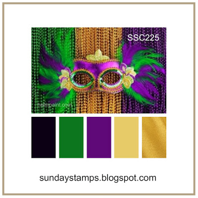 Tomorrow is faschnaut day in Pennyslvania and Mardi Gras in New Orleans. I’ve been to New Orleans but not during Mardi Gras but I have many memories of my grandmother making the faschnaut donuts. My job was to deliver them to neighbors and collect a little bit of money for her hard work. The challenge at Sunday Stamps is Bright Colors and the color seen below immediately reminded me of Mardi Gras colors of purple, green, gold. Using Distress Inks in wilted violet and pine needles which were sponged onto my white cardstock, then placed my stencil by Buddy Bonnie on top and inked with VersaMark then heat embossed with clear embossing powder. The black soot distress ink was applied over the entire image and then buffed off.