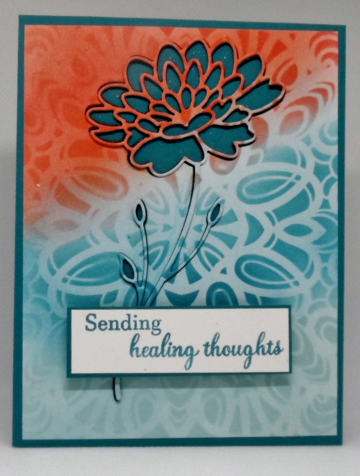 My card today will be entered into two challenges: The Color Challenge hosted by Laurie at The Paper Players using SU’s Bermuda Bay, Coastal Cabana and Calypso Coral. I inked my background lightly in the following GKD colors Coral Reef, Ocean Mist and Tranquil Teal then placed the GKD art stencil over the background and inked the same colors adding a darker shade. I die cut SSS Dahlia Stem from the background, layered it several times and popped the silhouette back into the die cut space. Sentiment is from GKD’s Stippled Flowers. The challenge for Just Us Girls is “Heal” for Sue’s Word Week Challenge.