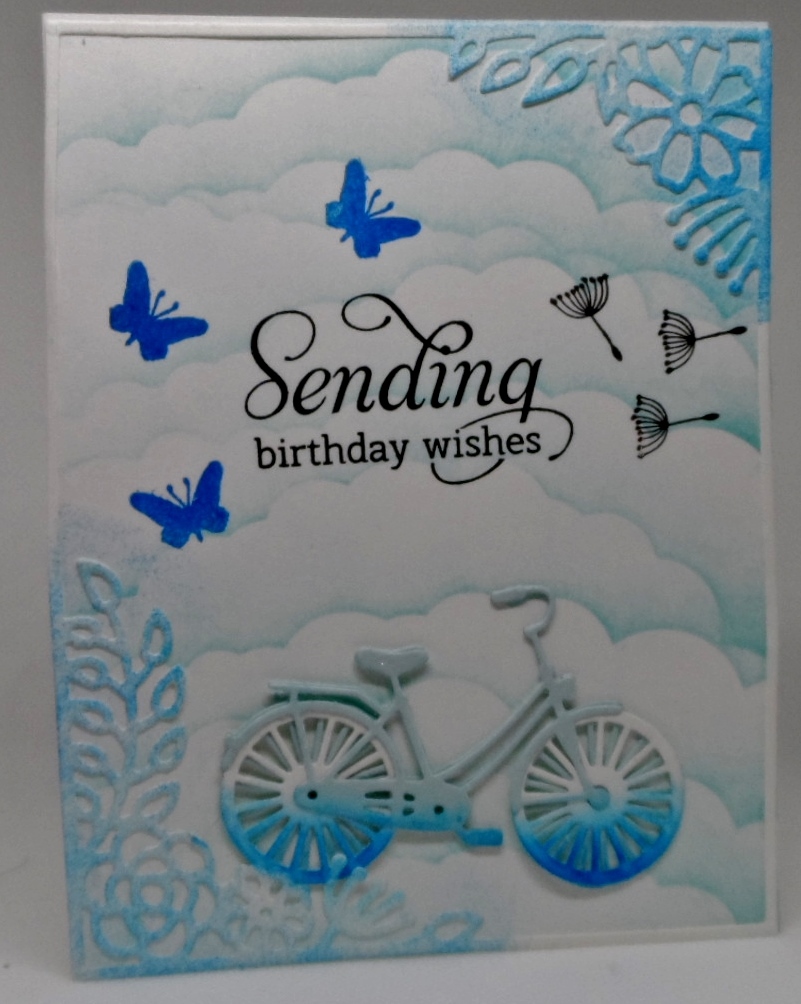 The challenge hosted by Nancy at the ModSquad Challenge is to include wheels on your project. I created a birthday card using SSS Classic Bicycle die, Momenta frame die, cloud stencil by Bonnie, and stamps from Sugar Pea Designs for Stamp of Approval. GKD inks in Blue Raspberry and Ocean Mist and my go to black ink is VersaFine Onyx Black.