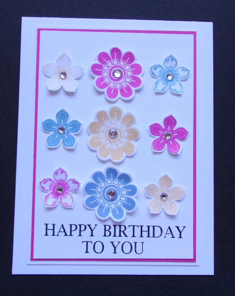 The stamps used are Gina K Designs Bold and Blooming along with matching dies, and Stampin Up Petite Petals with matching punch. I glued the flowers in the center then added a rhinestone, from Hobby Lobby. Love the colors and challenges.