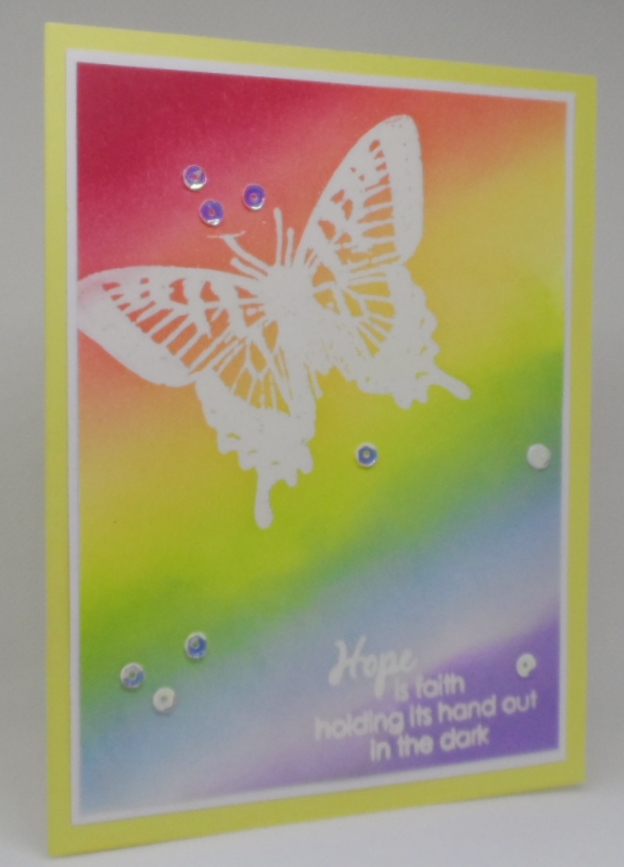 Playing along with the March monthly Mix Challenge at Gina K Designs hosted by Rema to include some kind of rainbow on your project. I pulled out an older GKD stamp set “Hope is Faith” in red rubber which seemed pretty appropriate during this time. My rainbow was created with GKD inks except for the yellow. Cardstock and sequins also GKD. Emboss resist technique used for my stamping in versamark and clear embossing powder.