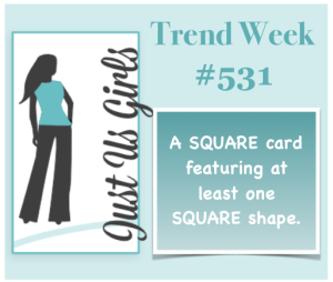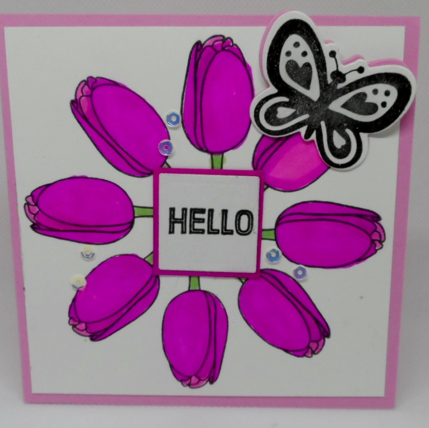 A square card featuring a square shape is the Just Us Girls #531 Challenge – Trend Week. So for my card I created a 4-1/4″ x 4-1/4″ square card using GKD’s wreath builder template for my Pretty Pink Posh Tulips stamp set. Good thing another square was required because I need to cover up my long stems. The sentiment and butterfly are a Recollections Valentine’s Day stamps and die set.