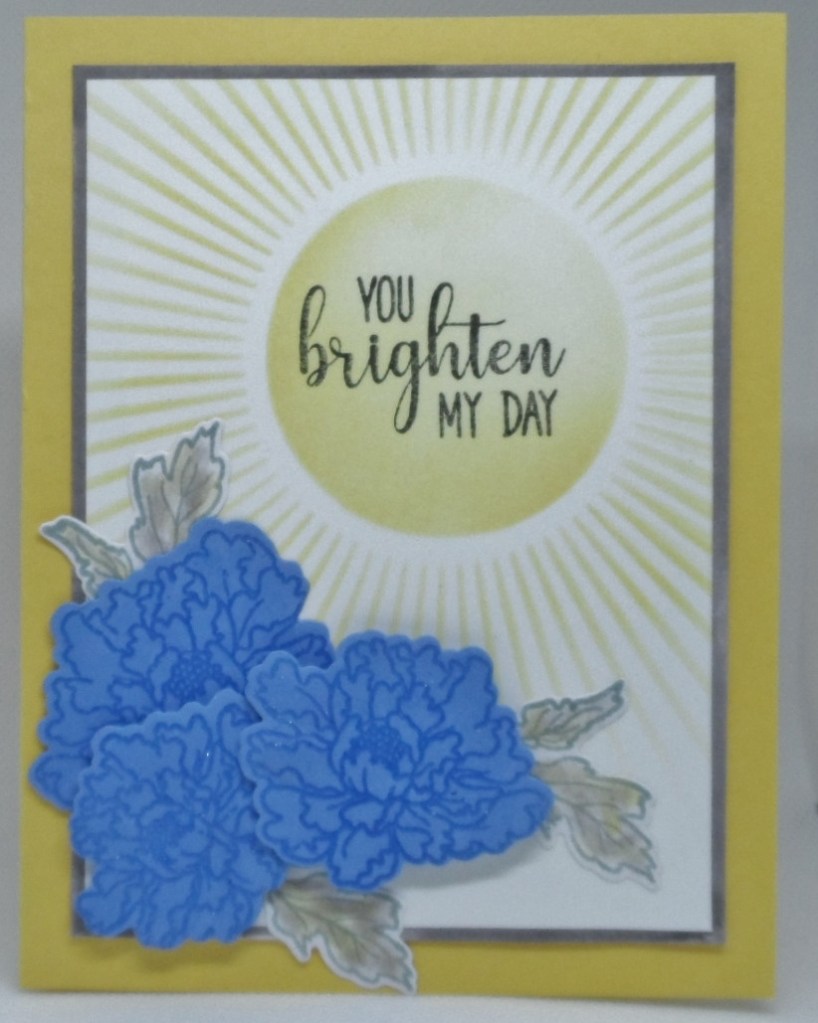 Or maybe I should say Powder Scattered Tan! The Paper Players Color Challenge is to use this interesting color combination of Seaside Spray, So Saffron, Grey Granite so I came up with Powder Blue for my flowers, Scattered Straw for the sun and rays, and Aqua Spectrum Noir Tan Marker for the border and leaves. The stamp set used was GKD’s Sunshine & Love STVKit and Sunshine Stencil.