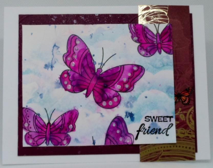 and the The Sisterhood of Crafters Challenge is one of Birds, Bees, Butterflies which of course I immediately chose butterflies. I used some clear gesso on my text vellum, then stamped the Pretty Pink Posh Beautiful Butterflies stamp set in Versafine black onxy ink. I colored my butterflies with color burst in marsala and rogue with a water brush, adding some dots with the Ice White Pearl Pen. My clouds using my Bonnie cloud stencil were created using Distress Oxide ink in Milled Lavender and Broken China. I liked the light milled lavender and am thinking I should have stopped there, then for good measure tried to add some white gesso through a cloud stencil…..not happening and trimmed that down. My side panel was cut from my favorite DCWV patterned paper pack The Mariposa Stack and layered on some GKD cardstock after using a darice butterfly embossing folder which cannot be seen but I know it’s there. The sentiment is GKD’s Sweet Friend that I cut apart.