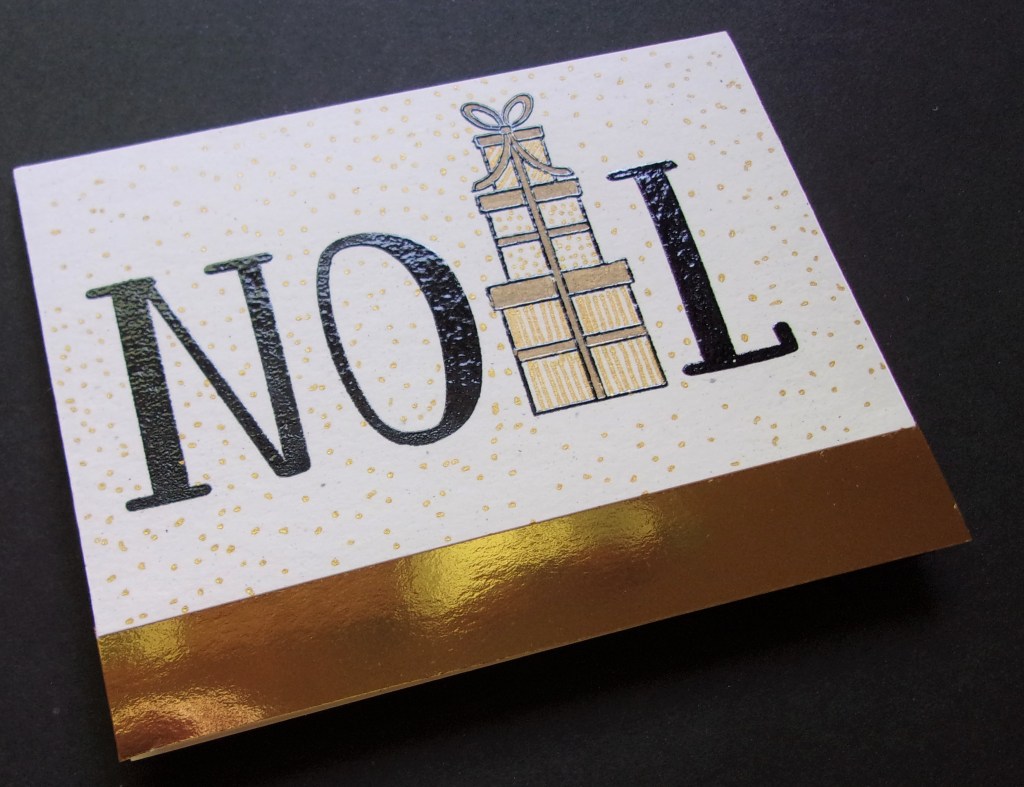 Day 10 is all about letter substitution. I have a stamp set by Maymay Made It called Noel. It is designed for letter substitution as it comes with Christmas images to substitute for the letter O or the E. I pulled out a stamp from The Stamps of Life penguins4Christmas, and used the gift for the letter E. To decorate the gift boxes I found a piece of patterned paper that had gold foil gifts all over it and I used it for inspiration. I used a gold Sharpie marker and a gold gel pen to decorate the boxes, like the patterned paper. I added dots all over the background with the gold gel pen, then added a strip of gold foil to the bottom of the card front.