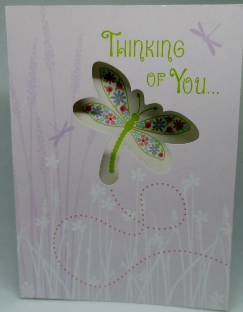 I received the bottom card from my girlfriend the other day and yesterday I just learned that her long time neighbor and friend passed away. Since dragonflies are my friend Joy’s soothing image, I decided to CASE the card I received from her as a sympathy card in the loss of her neighbor.