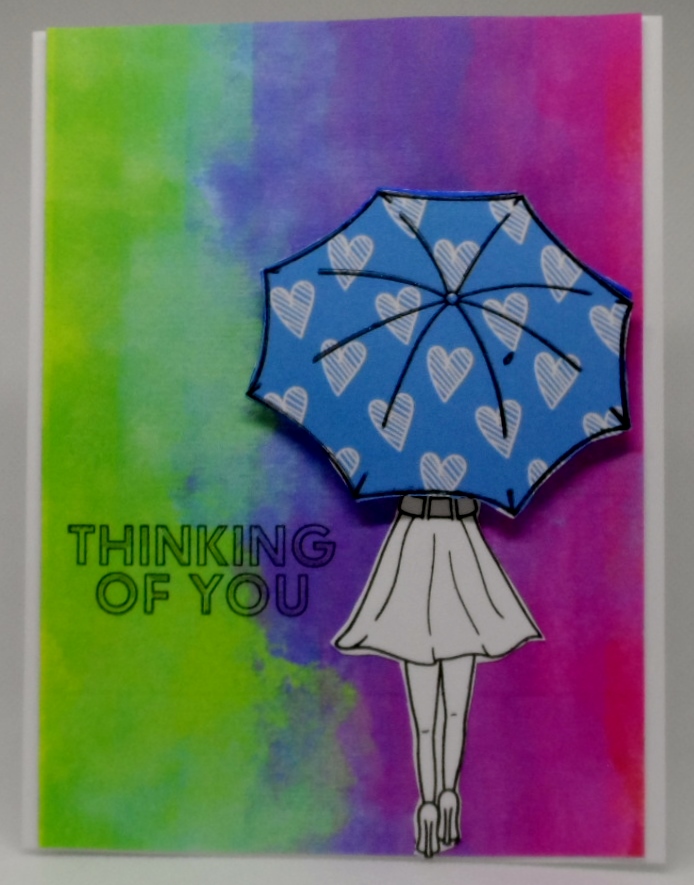 Nothing better than walking in the rain with a pretty umbrella especially when you realize that the end result could be a beautiful rainbow. I fell in love the the SSS Follow the Rainbows kit. The papers are gorgeous and the main image in the stamp set is the umbrella girl. So CASE-ing the SSS illustrations provided with this kit using a piece of this rainbow paper and a second piece of heart patterned paper fulfilled the Just Us Girls Challenge #538 — Wild Card Week Using 2 or more different patterned papers. I stamped and fussy cut the umbrella girl and then stamped and fussy cut the umbrella one more time popping it up and added a sentiment from the same stamp set.