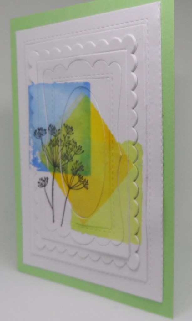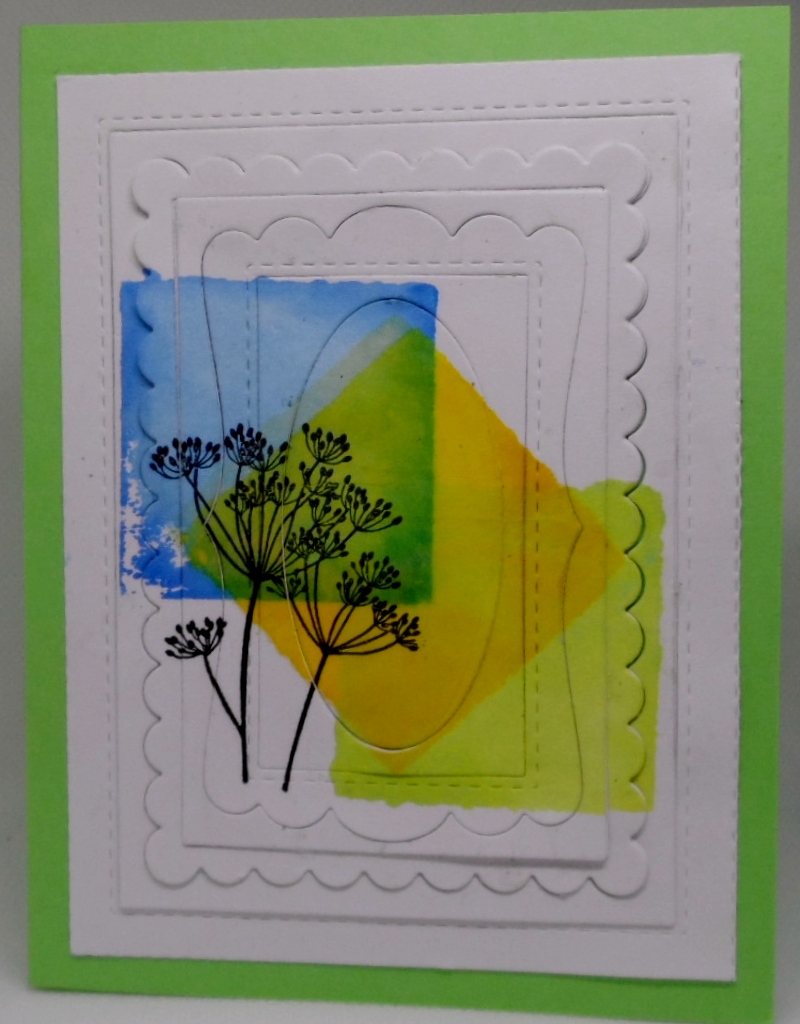 My card today started off using acrylic block stamping for the MIUCB #38 – Anything Goes + Acrylic Block Stamping challenge. I inked up an acrylic block with Distress Oxide Salty Ocean spritzed it with water and stamped, then repeated using Twisted Citron and decided I needed a third color so turned the block and inked with Mustard Seed. I then pulled out a Stampin Up oldie “Garden Silhouettes” and stamped that a few times in Versafine black ink.