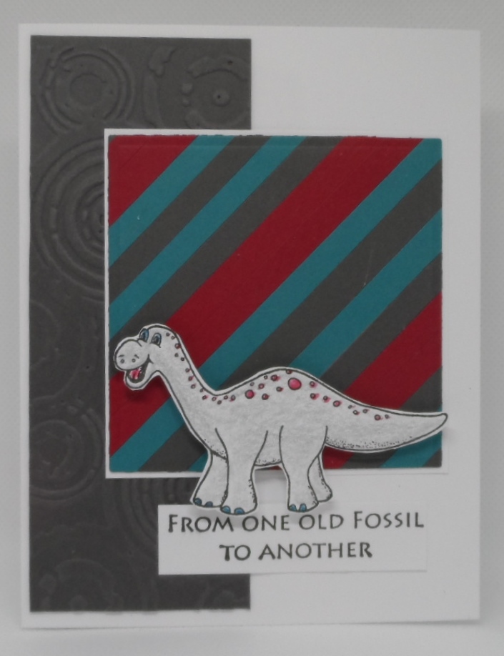 The Paper Players current challenge is a Color Challenge from Laurie using Real Red,Tranquil Tide and Basic Grey. Pretty color combination — I decided to get my my close to those colors in my GKD cardstock and cut 1/4″ strips of paper, glued them onto a base and die cut a square using Spellbinders large classic square for center point of this card. I also included a dry embossed grey using a Tim Holtz Alterations embossing folder by Sizzix and stamped the GKD image and sentiment from the Dino-Mite red rubber stamp set. Originally intended this card for our grandson but when I saw the sentiment decided on a friend’s “Medicare” birthday in July. I now need one of Stamp Buddy Gerry’s snarky verses for inside the card.