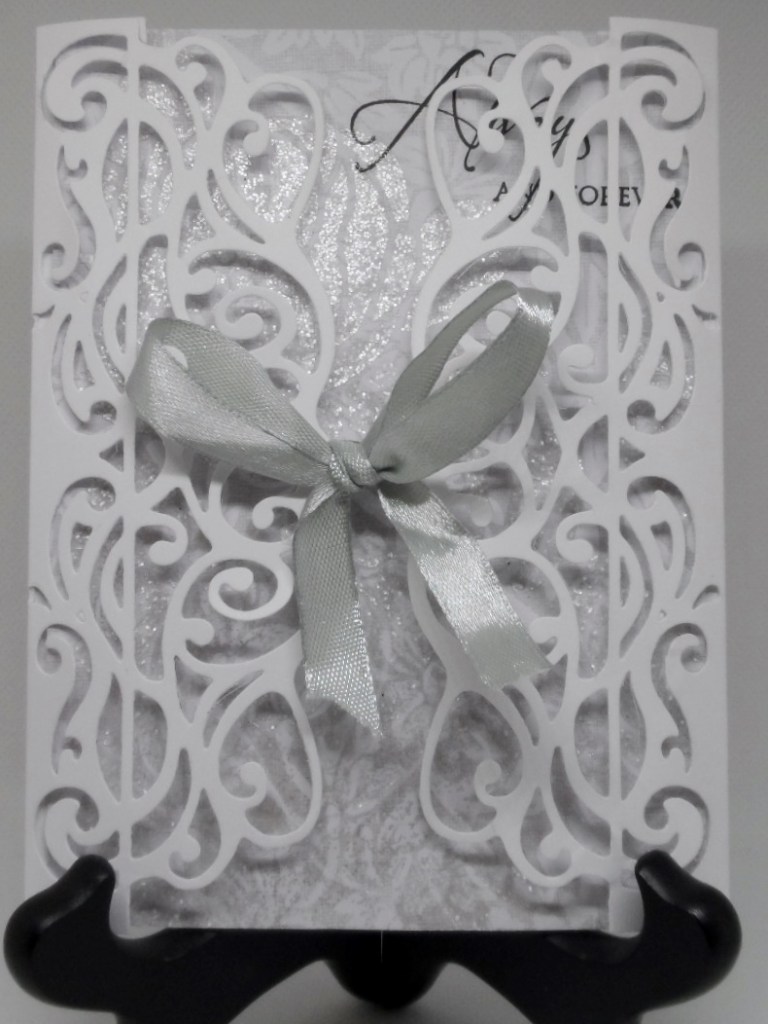 This card was created for the Double D Challenges theme of Wedding. I created my gate fold card using the Crafter’s Companion Die’sire edge’able Victorian metal die. My next step was to use a piece of DCVW Wedding patterned paper pack with a vintage print which was cut 4-1/4 x 11 and scored at 5-1/2. This center panel lifts up for the inside message. I really wanted more of a silver look but settled for some sparkle by using Brutus Monroe Alabaster Glitter Glaze over a SSS Peony Bouquet stencil. The sentiment is GKD’s Always and Forever stamp set. The silver ribbon was from my stash.