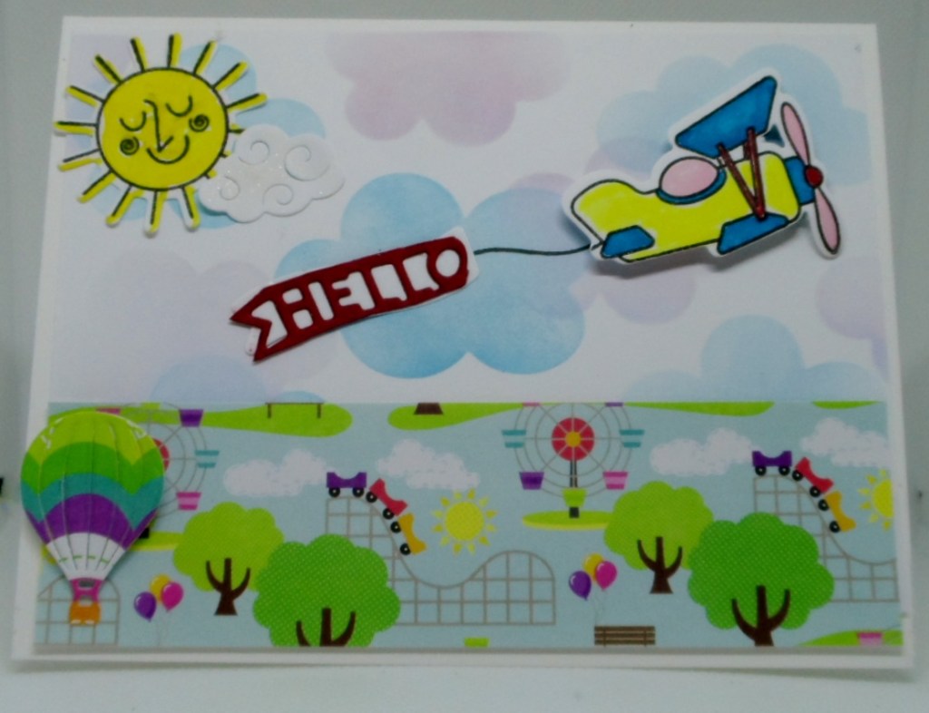 Summertime, Summertime, Sum Sum Summertime! Summer arrived on Saturday and this year we may have to experience alternative summertime activities. Well maybe not that different since we are not roller coaster fans. For today’s card which will be entered into the Dies R Us Challenge with a Summer Time Fun theme, I inked up the Hero Arts May My Hero kit which finally arrived at my door. The kit includes a stamp set and matching dies as well as few other dies. The dies used from this kit were the airplane, sun, cloud, hot air balloon and the banner. My clouds were created using a Pretty Pink Posh cloud stencil set and the patterned paper is Echo Park’s Summer Days.