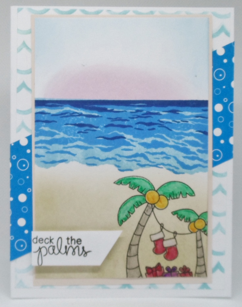 It’s a hot, hot day once again outside so I have been playing in my stamp room catching up with challenges. The first challenge is The Sisterhood of Crafters and and Ocean/Beachy theme. The second challenge is from The Paper Players Sketch Challenge: PP501. To meet these challenges, I created a background using Hero Arts Color Layering Waves stamp set and since I’m working on some Christmas Cards for troops I pulled out Newton’s Nook Sun Soaked Christmas which is also a beach themed stamp set. More waves were added for the sketch layer by using Pretty Pink Posh waves stencil and my diagonal stripe bubbles patterned paper is from GKD.
