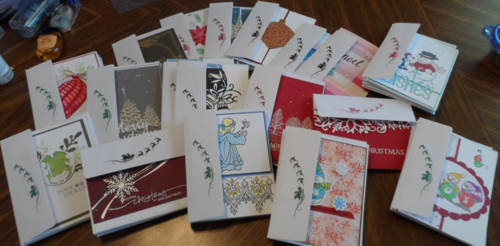 Busy day today at my home with girlfriends making Christmas Cards for Troops. I believe we finished 75 cards today to be sent to “Making cards for Troops”. I cut, stamped and prepped the cards and today was coloring and assembly day. We socially distanced in my living room today with only two girls at a table and after lunch completed our project in under 3 hours. Lots of laughing and fun for a good cause. My one friend found the information on Guideposts Magazine and since she has a daughter and son in law that are Navy Chiefs we thought it was be a perfect project for us. Masks were made by another girlfriend so we decided to show them off. I’m seated in the middle front row.