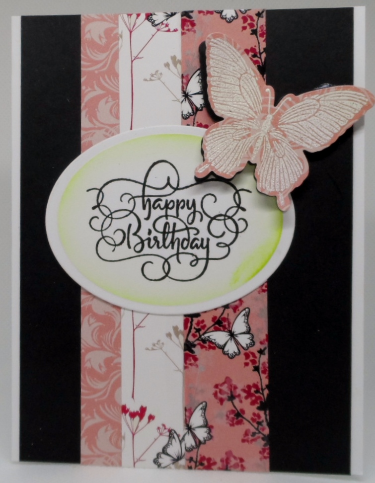 My card was created using GKD’s Birthday Blessing stamp set and matching butterfly die which is the theme of the Double D Challenge. My trio of patterned papers for the ModSquad Challenge are from GKD’s Fight Like A Girl patterned paper set and undetermined first layer of patterned paper. The sentiment was stamped in VersaFine Onyx Black ink and sponge lightly in GKD’s Key Lime ink while still in the Spellbinder’s large classic ovals die.