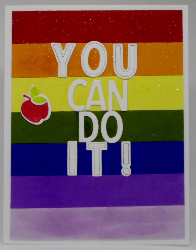 I decided to do rainbow stripes and die cut the letters from Concord & 9th’s Double-Cut Alphabet Dies. The apple (for the teacher) and die is a love Nicole stamp set. Finished the card off with some wink of stella to put a lot of sparkle on this card for Ms. Grammy.