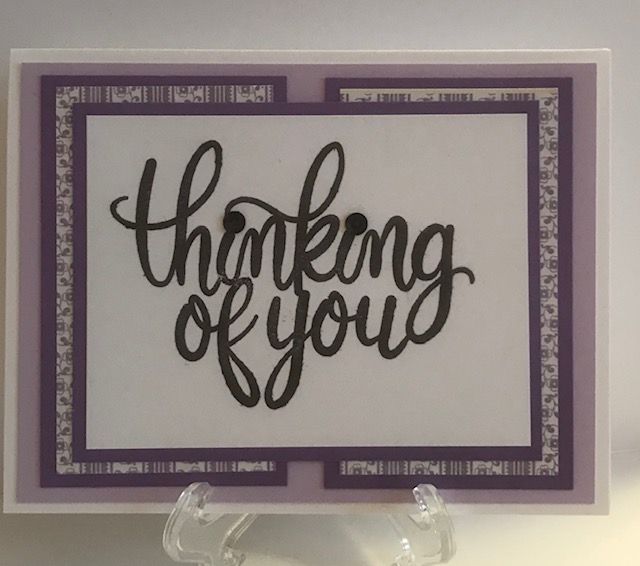 I’ve been playing with One Sheet Wonder patterns lately for inspiration. I need to replenish my Thinking of You and Birthday stash, and this is a quick and easy way to do it. I got 11 cards, plus a bonus card using scraps. The pattern paper is from Graphic 45’s Secret Garden collection. The mats are Edible Eggplant and Lovely Lavendar from Gina K designs. The sentiment is by Hero Arts. I used black sequins to dot the i’s for a little bling. I’m entering this in The Sisterhood of Crafters