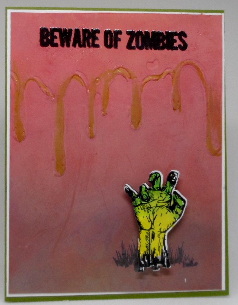 A Halloween card created using Tim Holtz Sizzix Framelits w/Stamps & Texture Fades set, sentiment was heat set with black embossing powder is from Hampton Art’s Zombies & Stencil set. The background was sponged with a variety of Distress Oxide inks including the new Crackling Campfire. To highlight the drippy bloooood I used wink of stella glitter gold and then smoothed it out with my fingers. Zombie hand was colored with some Arteza real brush markers.