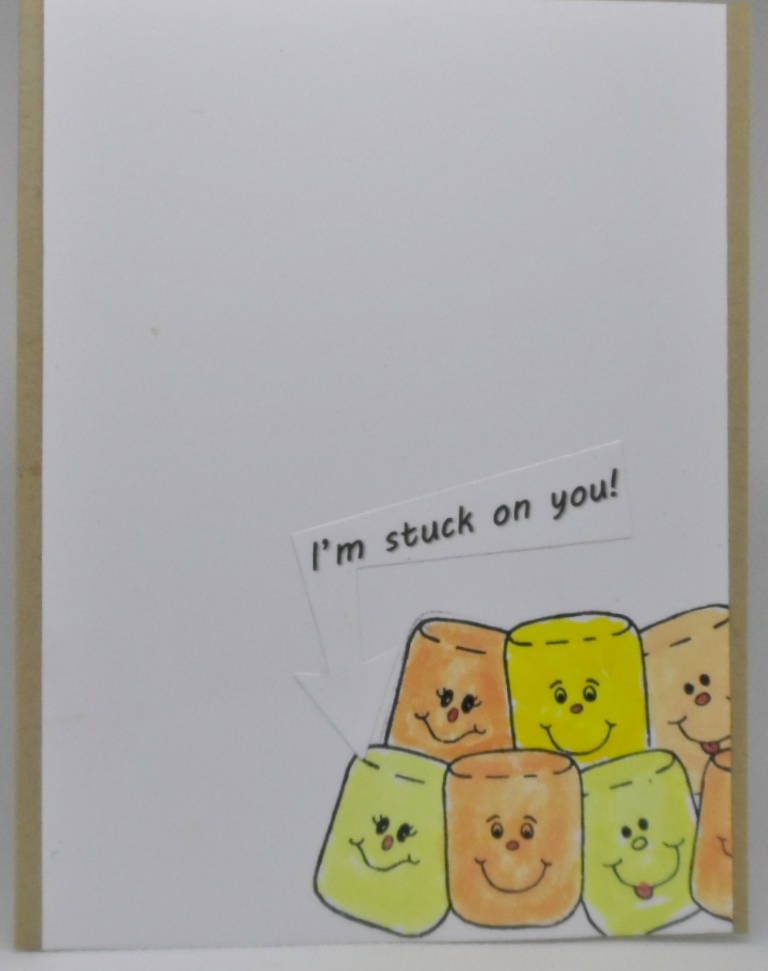 My marshmallow stamp is one that I have had forever and a day and probably never saw ink until today. This is a DRS. Designs stamp. The sentiment I made up and printed then die cut with a Momenta die set. I colored my marshmallow with some distress inks and a water brush. The focal image is mounted on kraft cardstock.