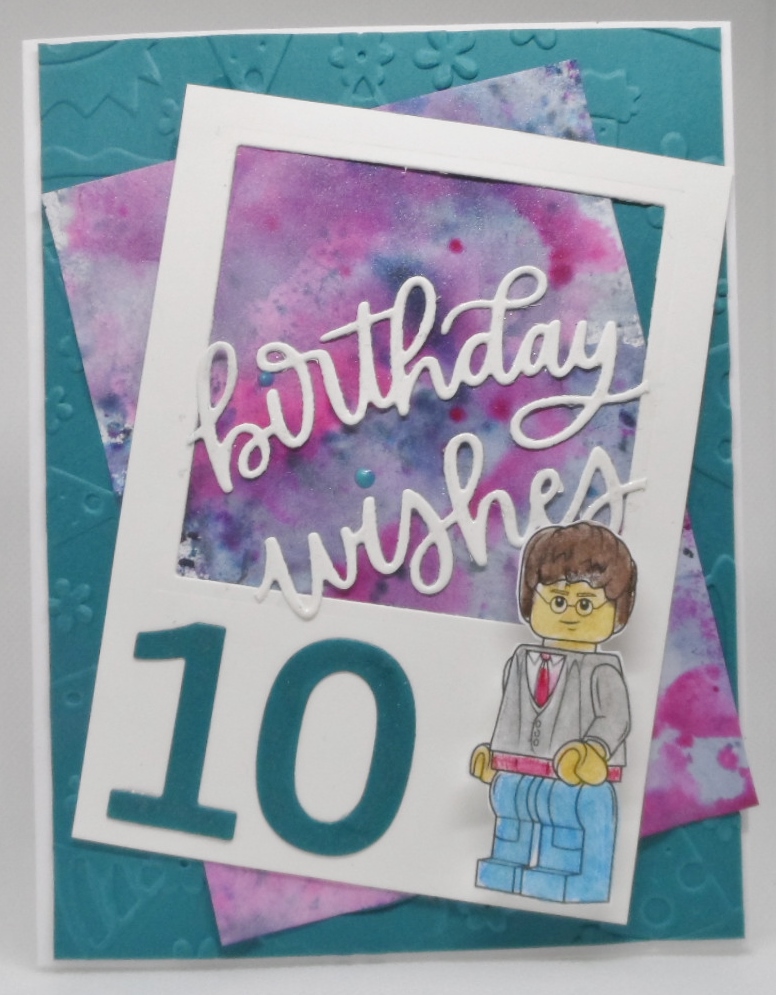 So for my October birthday card I pulled out a Sizzix birthday hat embossing folder, the sentiment is from the Pretty Pink Posh balloon shaker die but I cut out the sentiment from the balloon and inserted them into my cut out panel. The layering panel was one that I created awhile ago. Lego Harry Potter is an image from a free coloring page that was colored using my Stampin Up colored pencils and die cut the numbers from Momenta number dies. Thanks to Stamping Buddy Bonnie for a reminder to use our embossing folders and to Gerry for the awesome use of those free coloring pages.