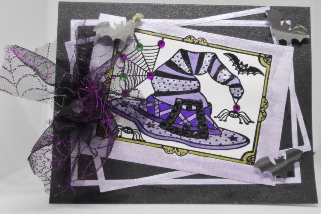For my card, my witch hat is an oldie but goodie from Outlines Rubber Stamp Company using Daniel Smith extra fine water color samples which was included in a My Monthly Hero set I colored the hat. Added some marker coloring in a darker purple and gold as well as some gem stones. Trying to remember if the Outlines stamps were made for gems as embellishments or pearl pen or nuvo drops for those area. After mixing the paint with perfect pearls I painted my background and die cut with Waffle Flower A2 nesting dies. I cut out two thin frames and made them a little wonky on my card because my image was off center. So it’s wonky all around to cover that up. I found my spider netting for a bow with a spider center and punched some bats with Martha Stewart punch.