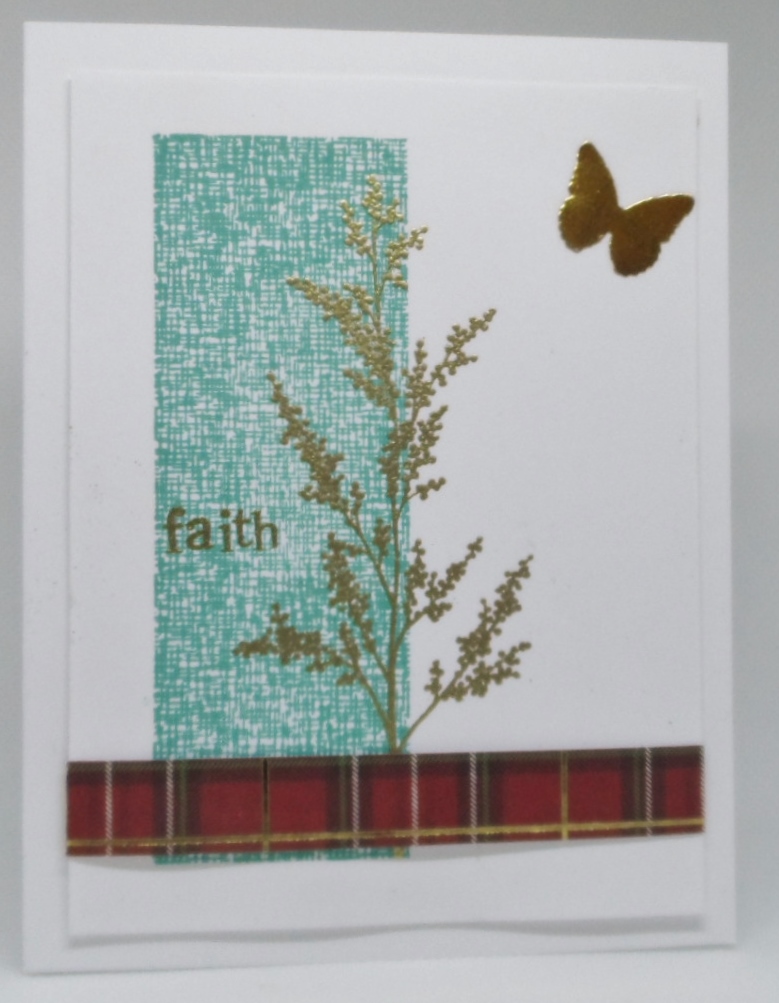 However, since I’m still not anywhere near ready for Christmas cards I decided to turn the colors into another fall/autumn/Thanksgiving card. My green is Distress evergreen bough ink and a Gina K stamp from the Petals & Wings set. I pulled out one of my favorite SU silhouette sets Garden Silhouette to gold emboss. The sentiment FAITH is also a GKD stamp from Triple Play Frame which also was gold embossed. So this is normally where I run into problems adding another color and I was looking to go minimalistic and used a strip of Recollections Christmas Plaid paper pad for Real Red. A punched butterfly in gold was added to finish off this card.