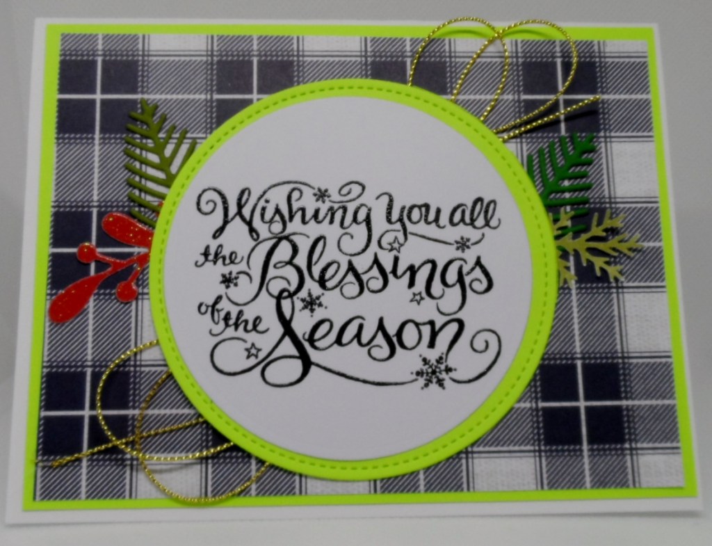 No Black Friday in person shopping today for me! Just having fun making my Christmas cards and joining in some challenges. For today’s card, I stamped my sentiment using an older Inkadkinadoo Warm Holiday Wishes stamp set cutting it out with a combination of circle dies from Spellbinders and Gina K Designs. After adding some gold twine and Christmas Foilage using the Simon Says Stamp die set, it was mounted on a piece of Recollections paper pad plaid then GKD Key Lime and attached to a white card base.