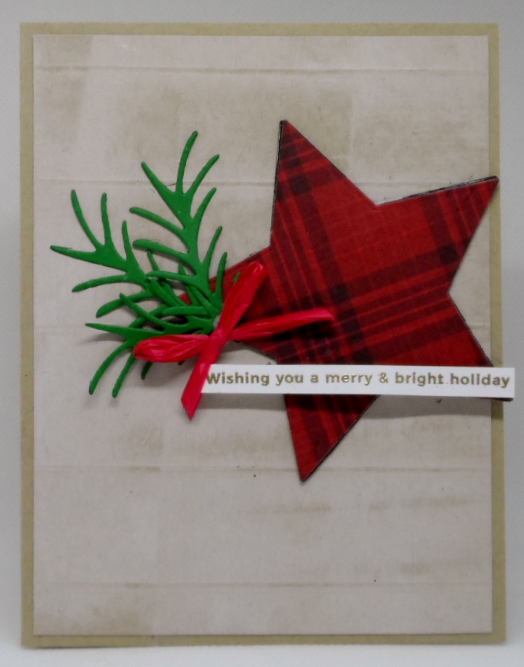 and to define your style. Well defining my all over the place style is a little more difficult than making the card. But for this card I’m thinking Clean & Layered For the card I die cut my star using Spellbinders Nestabilities star die set from Recollections Christmas paper pad. I also die cut my greens from CherryLynn dies and added a red raffia ribbon bow. The sentiment is SSS Peaceful Christmas. The card is mounted on GKD Kraft cardstock and the layering panel is also kraft, scored with white pigment ink swiped over it.