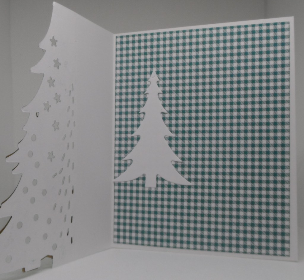 On cards like this where the card front does not cover the entire inside panel, I usually add a panel to the inside of the card that is sized, shaped, and positioned to be hidden when the card is closed. In this case, I’d probably cut another tree, center it, and stamp and/or write on that. (The die cut helps me see where it is “safe” to write and also gives me a clean spot when using patterned paper on the inside panel.) When that is not possible, I use the back of the card for my message.