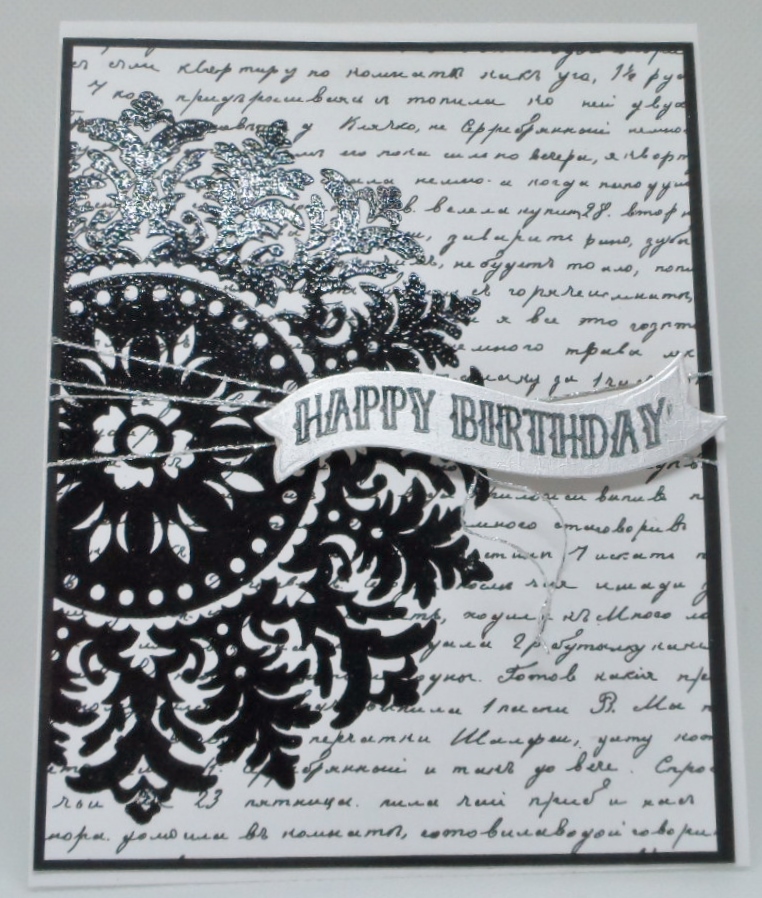 So after googling some options, I cased my card off of Pinterest….sorry lost the original post but I used my Stampin Up “Medallion” large background stamp, Gina K Designs Petite Patterns patterned paper, Hero Arts Ribbon Messages Stamp & Cut and Recollections Foil cardstock paper. The patterned paper can also be foiled but opted to keep it natural because I wanted to stamp the medallion on top of the paper and didn’t think it would work on the foil. My image was stamped in Versamark black ink and clear embossed, mounted on a black layer, added some silver thread and the banner was die cut from the silver cardstock and stamped once again in the versamark black and clear heat embossed.