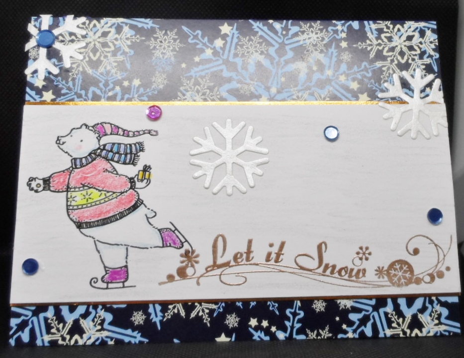 2. Your bear image is so cute, and I love how you positioned that awesome greeting as if being “written” by his skates. The snowflake die cuts look great with the patterned paper as well.