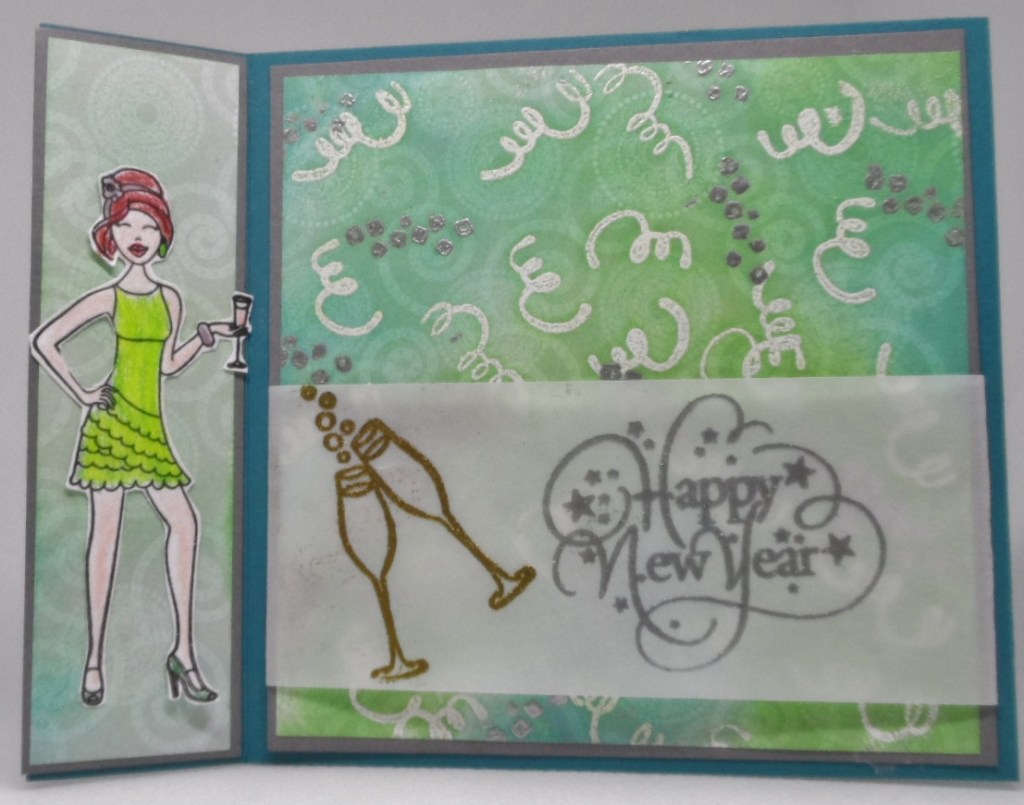but finally decided on Vellum, Square and Emboss Resist. My square element is the side fold card which features the focal portion of the card as a square. This section was layered with some GKD patterned paper which was heat embossed in white and silver embossing powder then inked with Applemint and Turquoise Sea inks. The stamps were from Gina’s Celebration Diva stamp set. Then using a piece of vellum I heat embossed a sentiment from Sparkling Christmas in silver and stamped the champagne flutes from Gina’s Cheers stamp set in gold. I decided to stamp, color and fussy the Celebration Diva and add to the side panel instead of adding twine.