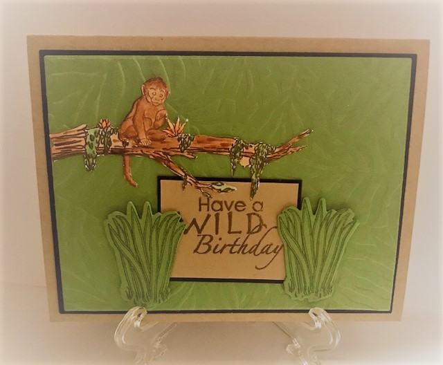 This My Monthly Hero Kit from June 2019 is new to me. I got it in the resale section of my local stamp store. I embossed the background by running the Palm Frond Stencil by Honeybee through my Platinum 6 along with a baby wipe. The baby wipe gave the right amount of moisture to help emboss the stencil. I stamped the monkey and branch then colored with Copics E23, E31, E33, E35, E57, G21, G46, YR65 and YR68, then cut using the matching dies. The tall grass was stamped in Fresh Asparagus ink on Grass Green cardstock and cut with the matching die. Before putting the monkey on the branch I fussy cut the monkey and cut off his tail so I could attach it behind the branch. I matted the focal panel with Dark Chocolate, then placed on a Kraft card base. The sentiment from Wild About You by GinaK Designs was stamped in Dark Chocolate on Kraft ink and matted with Dark Chocolate. The sentiment on the inside was computer generated “Don’t monkey around, just have a Happy Birthday.