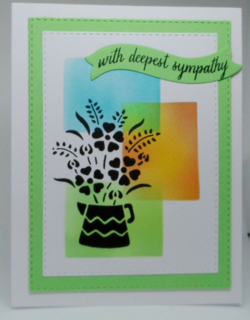 Gayle, those are beautiful Easter cards and will be very much appreciated by the troops! I love your card that you made for the challenge, as well. The sentiment banner overlapping the edges of the stitched rectangles is such a nice touch. I really like your overlapping inked rectangles on the background, as well. This is a wonderful sympathy card.