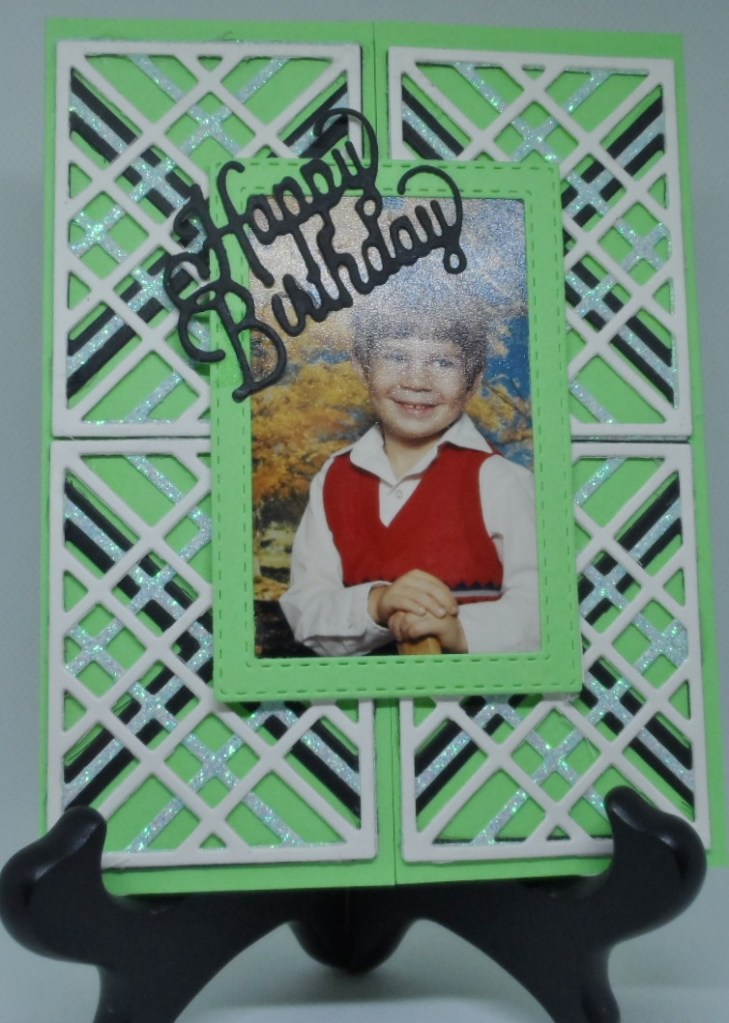 Celebrating our baby’s 40th Birthday! Yikes, how did that happen and when did he get so old!! This sweet photo was when our Will was 4 years old and to think in another week he will be 40 makes me really wonder where the time has gone. I used the Spellbinder’s kalidescope plaid die to create the panels which fit perfectly on a gate fold card and the word die cut is an unknown. I’m loving this card almost as much as our son.
