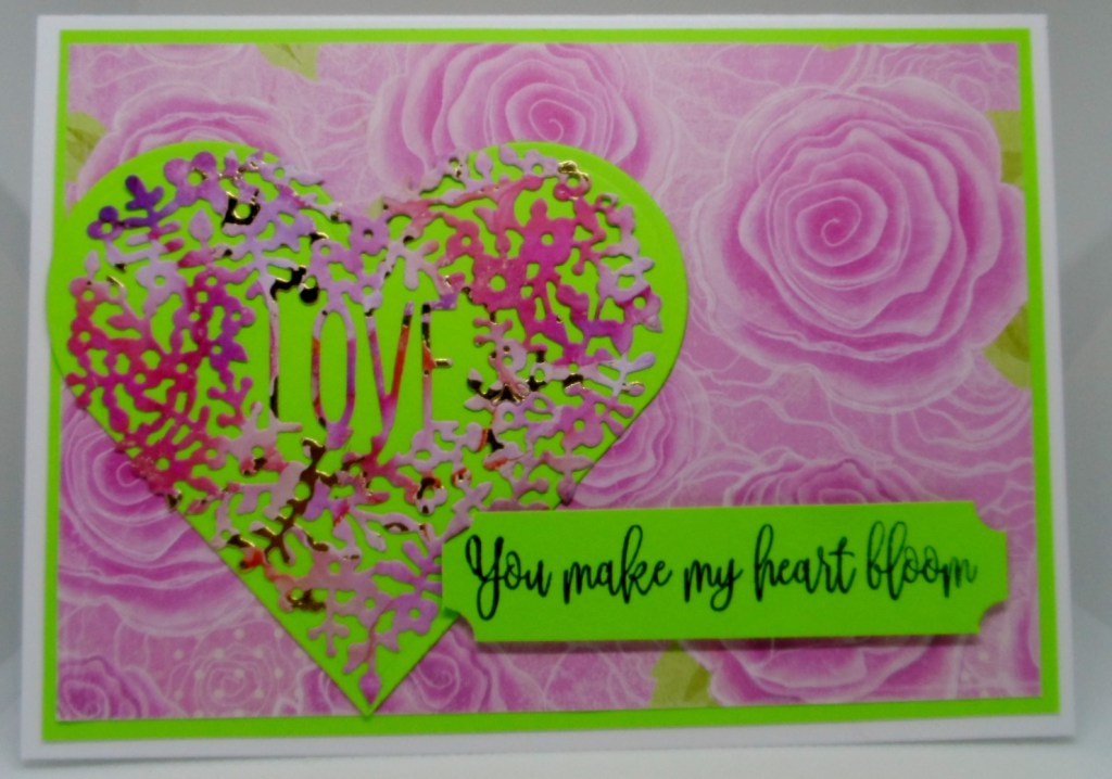 Since I am still on a patterned paper kick, I found this pretty flowered paper in my stash so decided it will cover the flower part of the challenge. My hearts were die cut using a Momenta very detailed heart die with flowers and layered it on a Spellbinder’s Classic Hearts die set. My stamped sentiment is Wealth of Wishes from Gina K Designs. This is large die and large floral pattern were telling me I needed a 5×7″ card base.