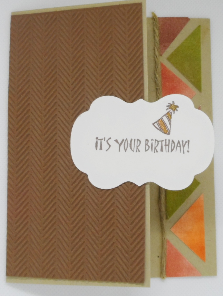 Almost forgot the twine….I ran a line of glue to the edge of my triangle design and stuck my twine down. 🙂 I do believe that is everything: masculine, herringbone embossing folder, labels 14 die cut, autumn inks!