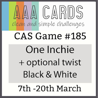 The challenge at AAA Cards Clean and Simple Challenges is to create a card using an inchie…..one inchie, no sentiment with a black and white option. I never really got into or completely understood “inchie” but that didn’t stop me from picking up an Inkadinkadoo inchie stamp set many years ago. I stamped the butterfly inchie in versamark ink on black cardstock and heat embossed in black. I also cut a one inch square to off set my stamped image and rounded the corners of the card base. Hmmmm….looked unfinished so in keeping with the challenge decided to work on the inside of the card. Using Butterfly on the Border die from Technique Tuesday, adding some color and stamping a sentiment from Concord & 9th’s Dahlia turnabout stamp set in versamark and white embossing powder the card seemed a little more interesting.