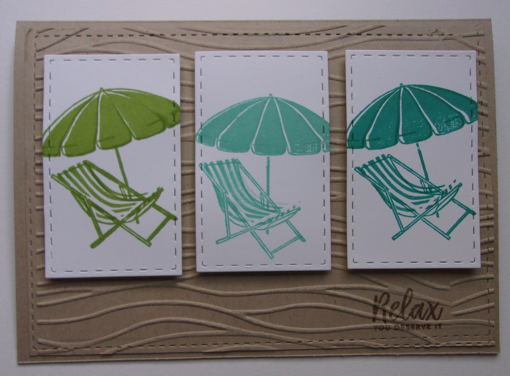I used the stamp set Beach Happy from SU, dated 2019. The ink colors I chose are SU Granny Apple Green, Coastal Cabana, Bermuda Bay and GKD Kraft. I used SU Crumb Cake cardstock for the card base and the Seaside Embossing Folder also by SU, retired. I used a stitched rectangle die, from The Stamps of Life, to cut the umbrella images out and the size wouldn’t fit on an A2 size card, so I made a 5 X 7 inch card base so the three umbrellas would fit across the card. I used partial embossing to make the stitched border around using a slimline die, but then I felt it was missing something so I added the embossing. I saw this idea on Pinterest for this stamp set, and modified it to fit the color challenge and the size of my dies.