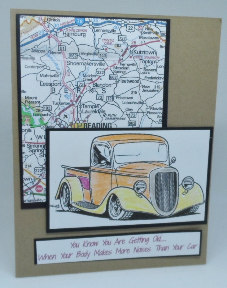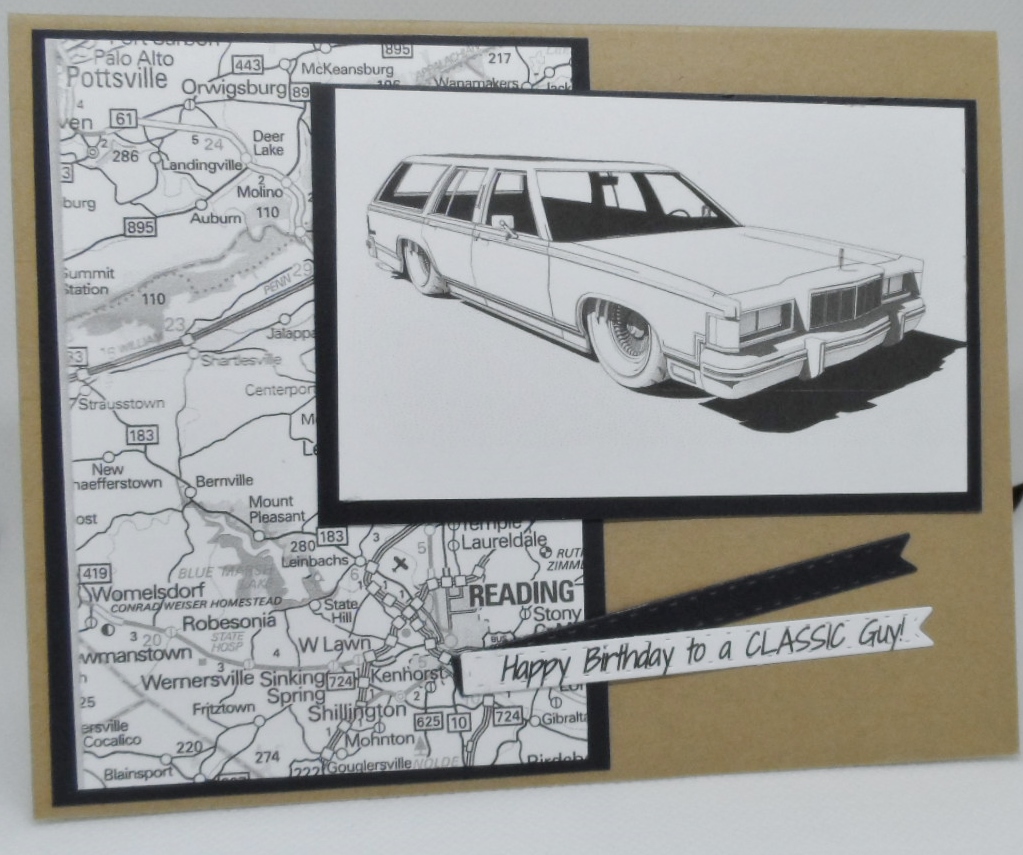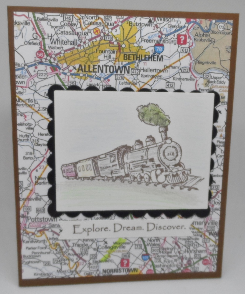 Playing along with the masculine challenge with the As You Can See It Challenge today. I had a lot of fun creating this group of cards most of which were included in the mailing to the “Making Cards for Troops” group. The image was found online and colored in with colored pencils. The sentiment is computer generated and the map was copied from road and street map that my husband used during his driving career before GPS was available to him. He still would rather look at a map!! Two other samples include one in black and white on kraft and the other is for those “Y”s who prefer trains.